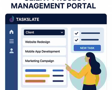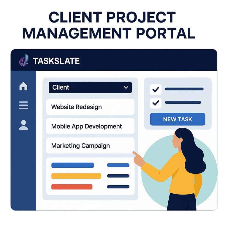 The Client Project Management Portal is a powerful, intuitive web application developed by TaskSlate Technologies to streamline project collaboration between our team and clients. It acts as a centralized hub for tracking project progress, managing tasks, setting deadlines, and maintaining transparent communication—all in real-time.